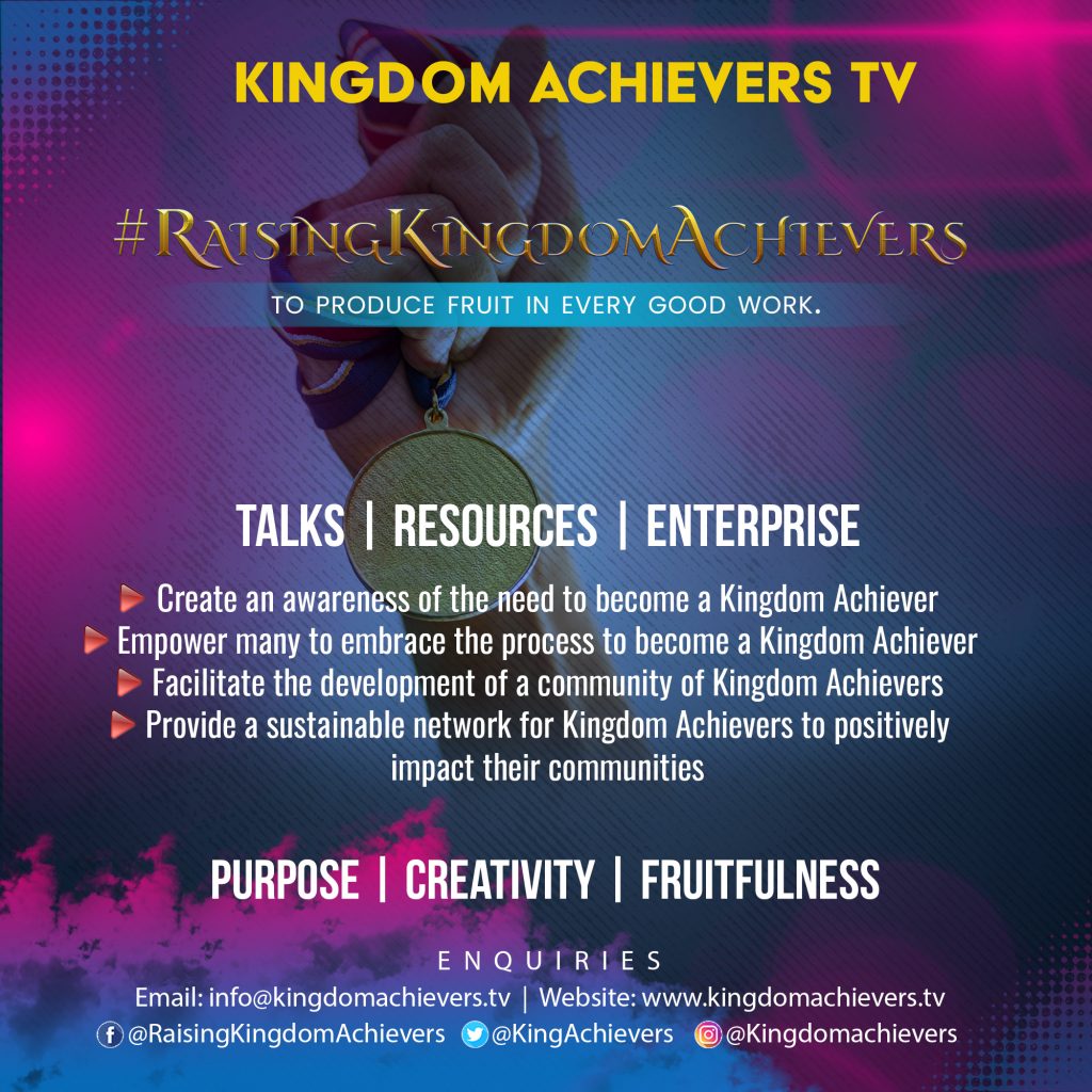 Kingdom Achievers TV is the multimedia platform to mobilise many to engage with our campaign – #RaisingKingdomAchievers to produce fruit in every good work, facilitate the development of a network of Kingdom Achievers producing fruit in every good work and positively impacting their communities.